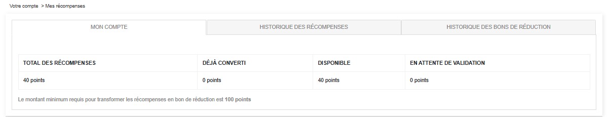 Vous y trouverez le détail de vos points, leur historique et la possibilité de les convertir en bon d’achat à tout moment.