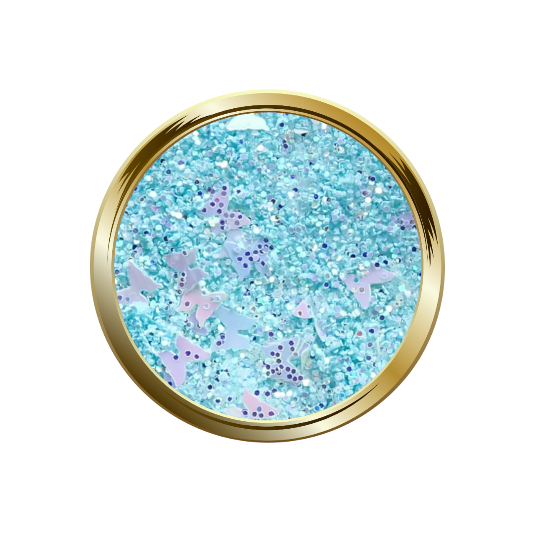 Ce mélange enchanteur associe des paillettes bleues fines à moyennes à des papillons irisés holographiques, pour un rendu lumineux, délicat et poétique.