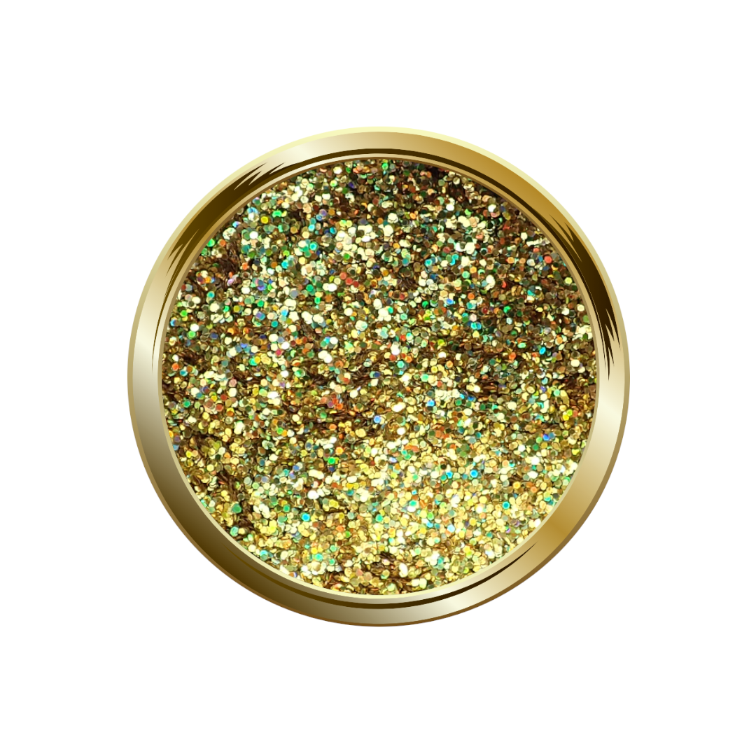 L’Electric Spark Metalgold de COD Nail System est un mélange de paillettes fines à moyennes, métalliques et holographiques, dans une teinte or intense et lumineuse.