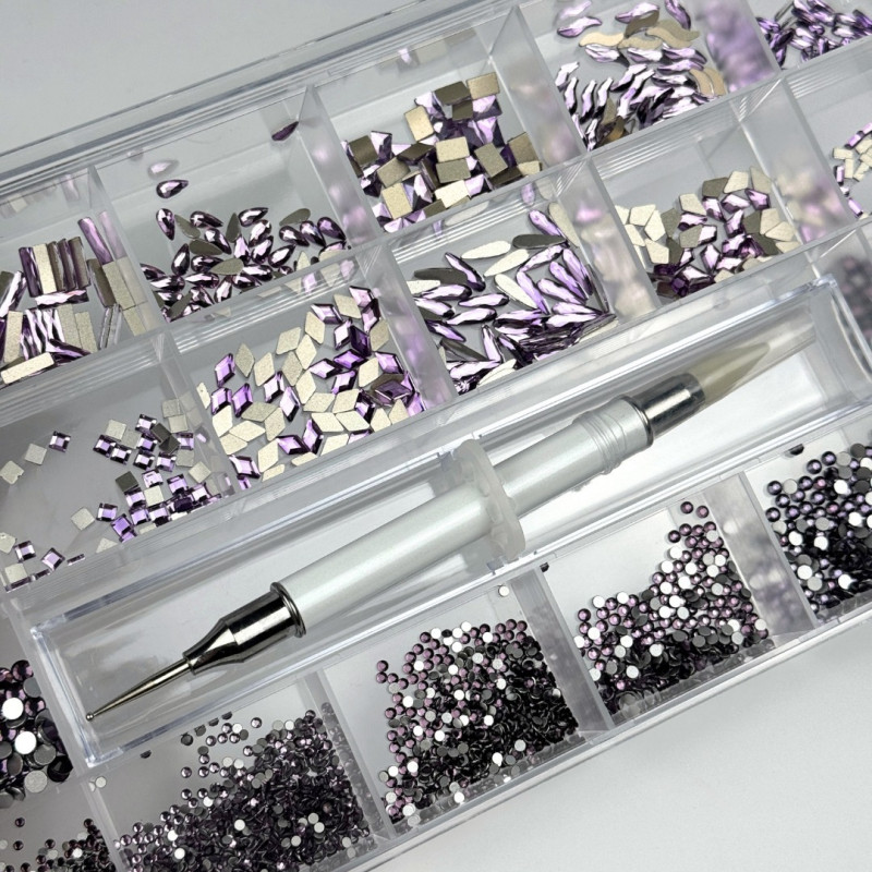 Composée de plus de 3 100 strass violet, cette box propose 12 formes décoratives (600 pièces) et 8 tailles variées (2 500 pièces) pour offrir une liberté de création totale : du détail raffiné à la composition la plus audacieuse.