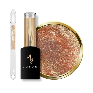Plongez dans une ambiance luxueuse avec My Color Mystic Pearl, un vernis semi permanent aux nuances dorées et cuivrées sublimées de reflets scintillants et métallisés. Son éclat riche et sophistiqué apporte une chaleur lumineuse et élégante à toutes vos manucures.