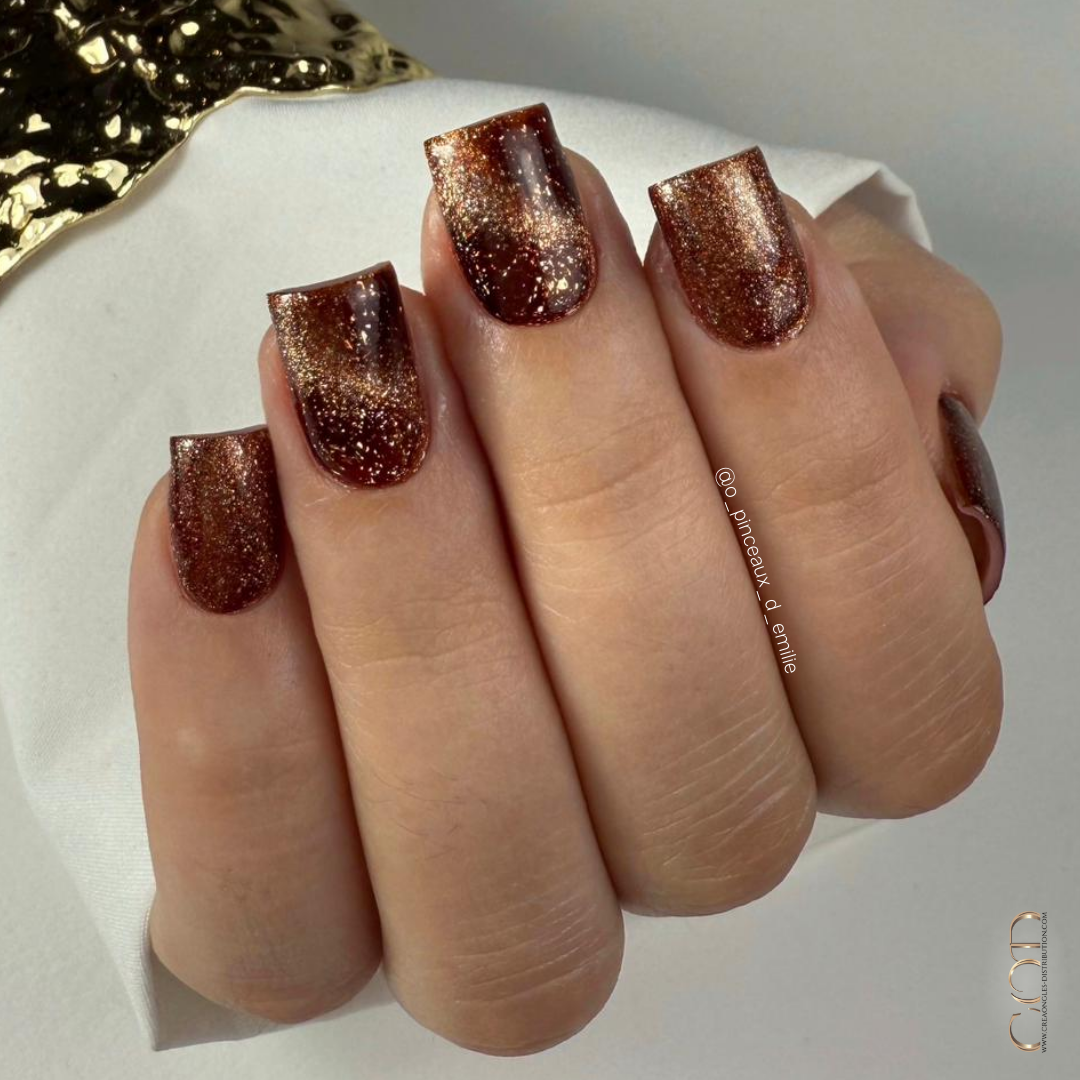 Grâce à la combinaison de micro-paillettes bronze/cuivre, de particules aimantées et de flakes dorés-cuivrés, le vernis propose un équilibre parfait entre chaleur, élégance et lumière. L’effet Cat Eye caramel doré apporte une dimension lumineuse raffinée.